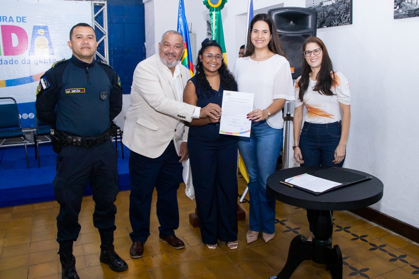 A mesa da solenidade contou com a presença da prefeita Mirella Almeida, do secretário de Segurança Cidadã, Coronel Pereira Neto, da secretária Executiva de Atenção à Saúde, Virgínia Fernando, do secretário de Gestão de Pessoas e Administração, Luciano Brasileiro, da secretária Executiva do Administrativo, Mara Anunciato, e do comandante da Guarda Municipal, Abimael Simplício.